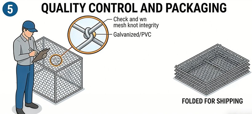 The fully assembled gabion boxes undergo a rigorous quality control inspection. This includes checking dimensions, inspecting the mesh for defects, and ensuring the lacing is tight and secure. Galvanization or PVC coating integrity is also verified. The finished gabion boxes are then folded flat for efficient transport and storage.