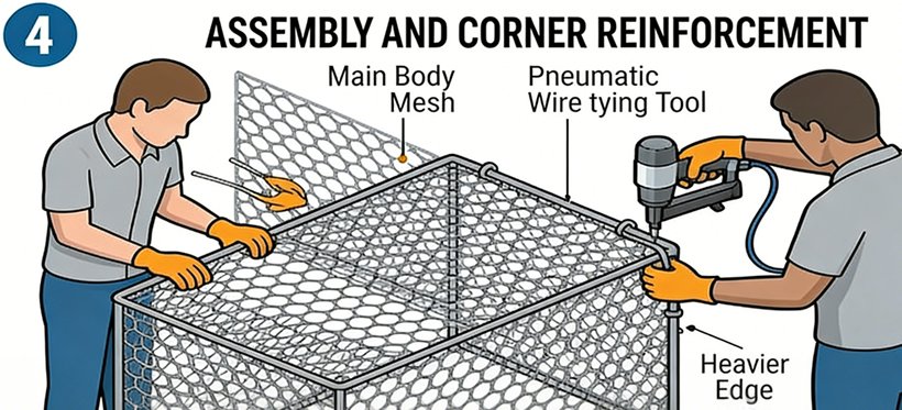 The shaped mesh components are assembled into a box-like structure. Heavy-gauge edge wires, thicker than the mesh wire, are used to reinforce the corners and edges of the gabion. This adds crucial structural rigidity and helps distribute loads evenly. The base, sides, and diaphragms (if applicable) are securely laced together using specialized wire.
